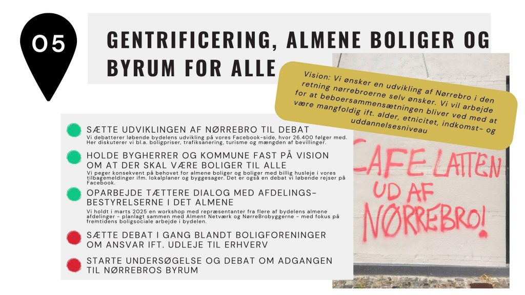 - En udvikling af Nørrebro, der sker i en retning, som beboerne på Nørrebro ønsker. Bl.a. andet med inspiration i det almene beboerdemokrati.