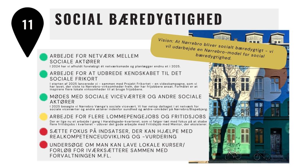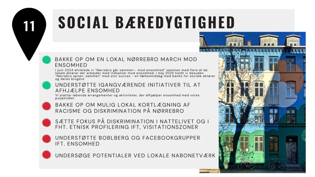 Vi vil arbejde for, at Nørrebro bliver social bæredygtig. Vi definerer »social bæredygtighed« som en understøttelse af følgende af FN’s verdensmål: 1: Afskaf fattigdom, 2: Stop Sult, 3: Sundhed og Trivsel, 4: Kvalitetsuddannelse, 5: Ligestilling mellem kønnene, 11: Bæredygtige byer og lokalsamfund og 16: Fred, retfærdighed og stærke institutioner. Vi vil på dette område bruge verdensmålene som pejlemærker.